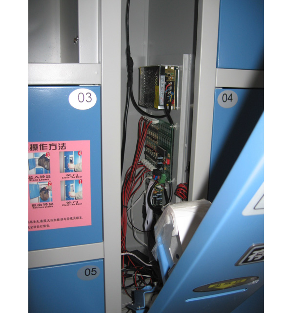 2.停電或卡門(mén)時(shí),用管理鎖匙打開(kāi)中控板,各號箱門(mén)內側的電磁鎖下端有一金屬柱子,用手指輕拉,即可彈開(kāi)箱門(mén)(機械開(kāi)鎖方法)。